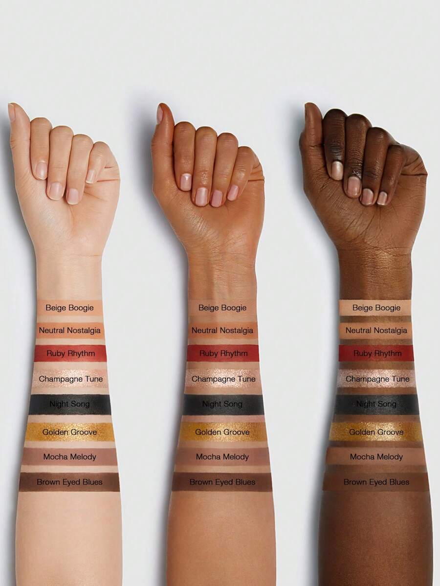 التركيبة غنية بالأصباغ، سهلة الدمج، ومقاومة للتلطخ، يعني هتفضلي متألقة طول اليوم من غير ما تحتاجي تعيدي التطبيق. كمان الباليت خالية من الكحول والبارابين، ومش مجربة على الحيوانات، فهتكون آمنة تمامًا على بشرتك.